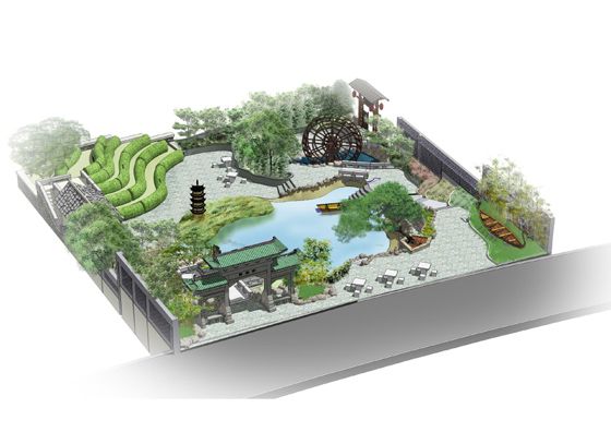 2、總體布局:整體為繞湖環(huán)形布局。從建構筑和整體布局上來(lái)看,安康園由香溪牌坊,南宮山盆景,香溪棧道,茶園牌坊,漢陰農田--漢水龍舟是一個(gè)由“高”-“低”-“高”的過(guò)程。